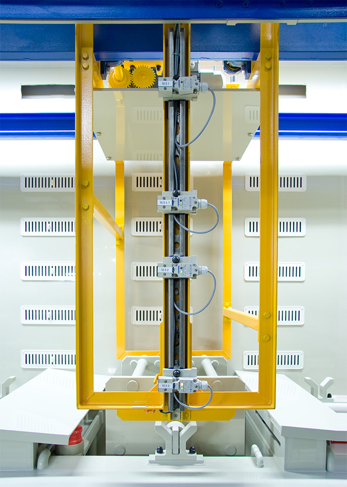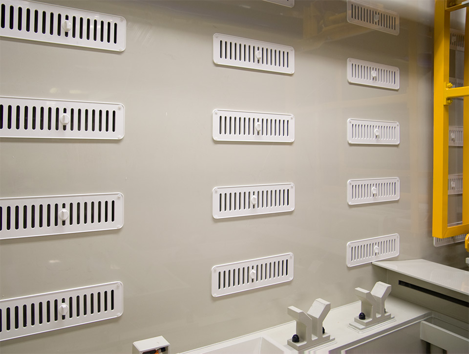 Die Abluft wird durch individuell einstellbare Schlitzschieber an der Rückwand abgesaugt. Für den Personenschutz während des Betriebes der Anlage sind große Klarsicht-Schiebefenster (mindestens 3 in der kleinsten Version) angebracht, so dass der Bediener jederzeit vor Flüssigkeitsspritzer (z.B. durch Säure) geschützt ist. Desweiteren ermöglichen die Schiebefenster eine optimale Kontrolle des Produktionsprozesses und erleichtern das Be- und Entladen des Fahrwagens.